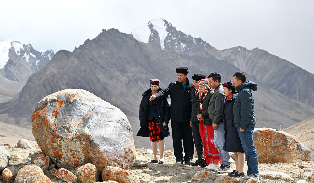 “过去要骑马或骑牦牛,走一整天才能到这里。”60多岁的龙吉克·卡德尔退休后,继承父亲义务护边的遗志。此行,他带着新婚侄子夫妇。“接力棒现在传到年轻一代手里,要继续履行世代守边卫国的使命。”在家训石旁,龙吉克向家族年轻一代叮嘱道。
