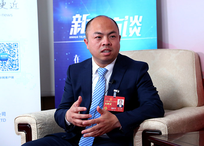 全国人大代表、浙江省湖州市安吉县余村村党支部书记汪玉成接受新华网采访。