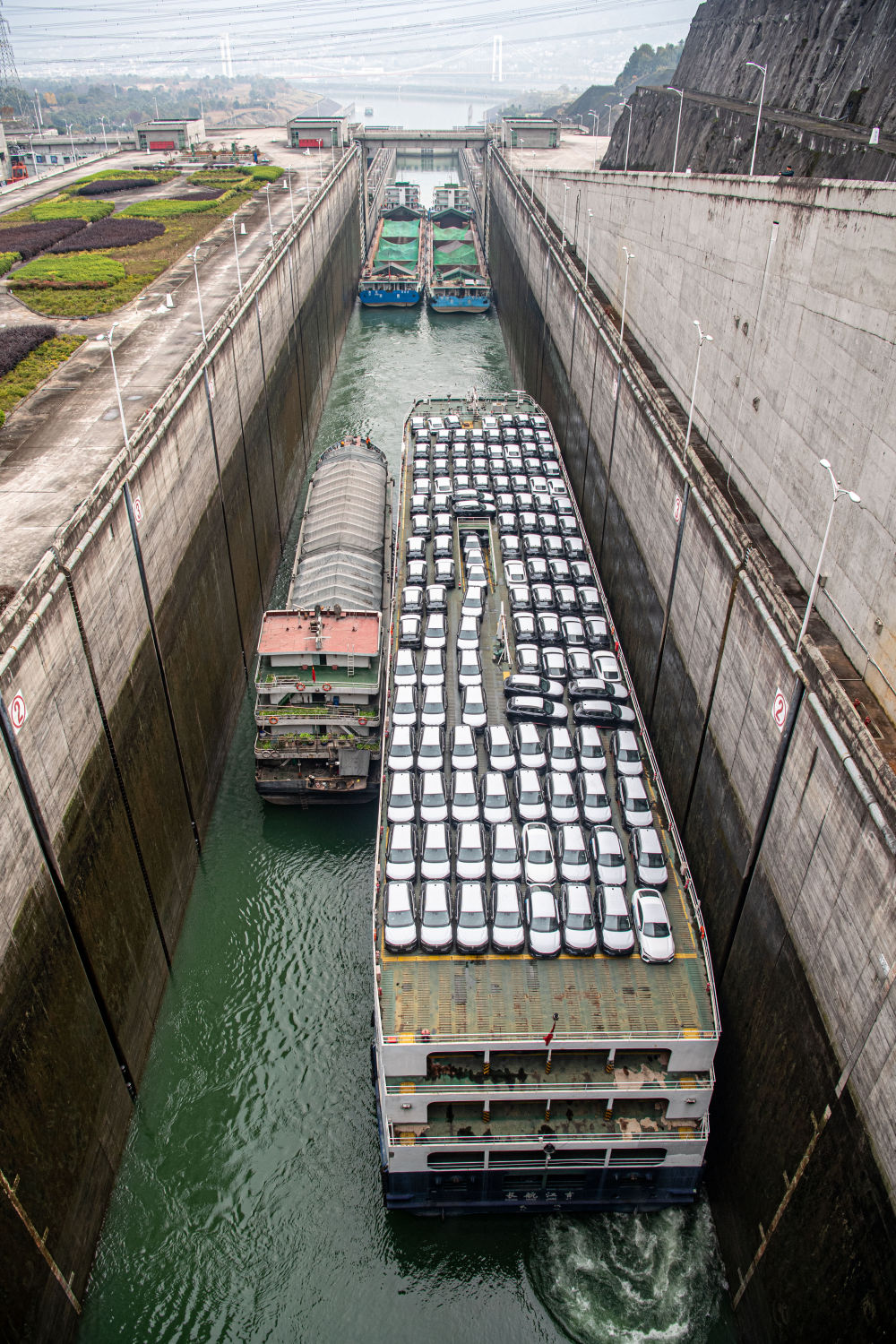 来到三峡双线五级船闸,一艘满载着产自重庆的新能源汽车的船舶正在过闸。船闸上下落差高达113米,相当于约40层楼的高度,是目前世界上连续级数最多、总水头和级间输水水头最高、技术最复杂的内河船闸。船舶过闸,如同爬上一阶阶巨大的楼梯。