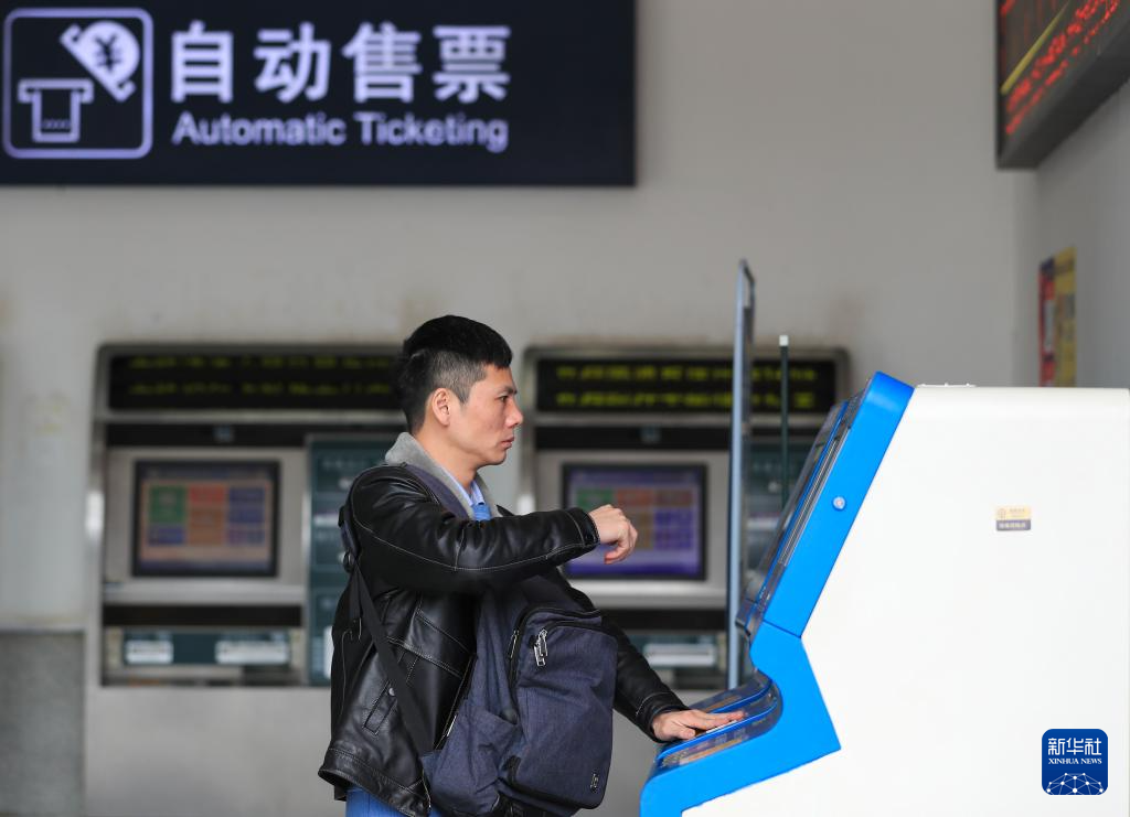 1月12日,旅客在贵广高铁贵州从江站自助售票处取票。新华社发(罗京来 摄)