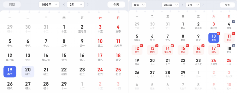 而1996年的春节则在2月19日