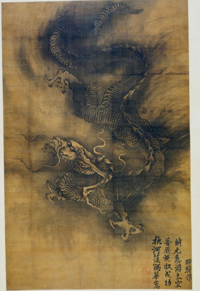 在《墨龙图》上,还有陈容题的一首诗:“抉河汉,触华嵩。普厥施,收成功。骑元气,游太空。”诗中驰骋天际、飞临高山的奇绝想象,与画面上盘旋矫健的飞龙互为呼应,展现了势震山河的雄壮意气。
