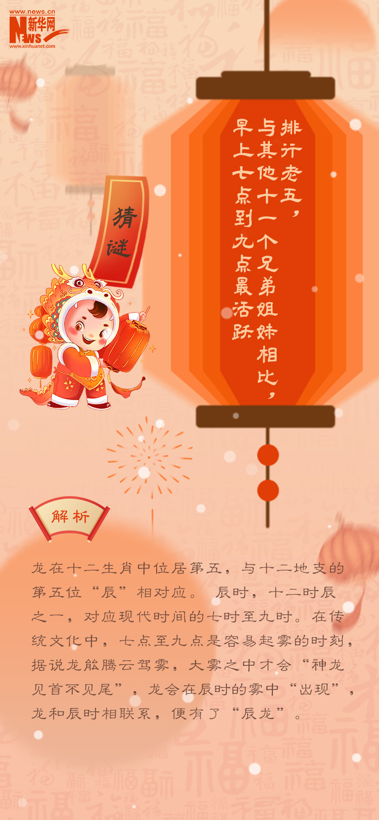2024年是农历甲辰龙年。“龙”在中华民族心目中有着重要地位,被视为吉祥、权威和神圣的象征。在历史发展长河中,“龙”逐步汇聚起丰富的文化内涵与美好寓意,成为人们精神信仰和文化生活的重要组成部分。春节期间,《寻“龙”记》带您领略博大精深的中华“龙”文化,本期给您带来一组妙趣横生的灯谜,这组灯谜的谜面虽然各不相同,但谜底都是同一个字,一起来猜猜。
