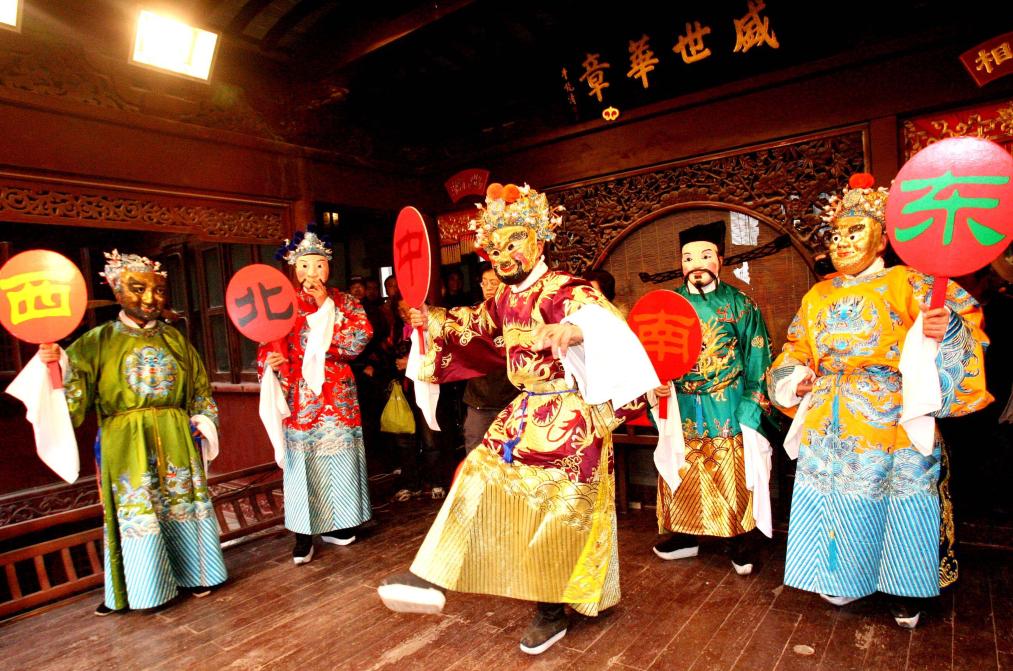 2009年1月30日是农历正月初五,由民俗演员装扮的“五路财神”在苏州山塘街古戏台表演。