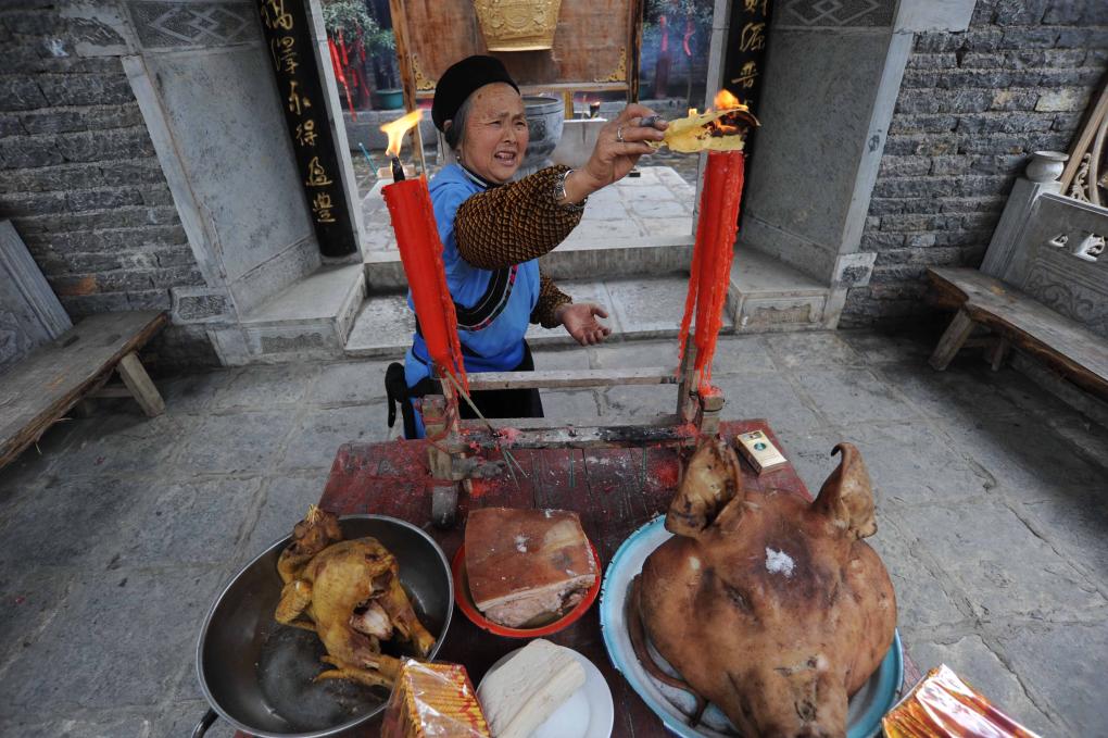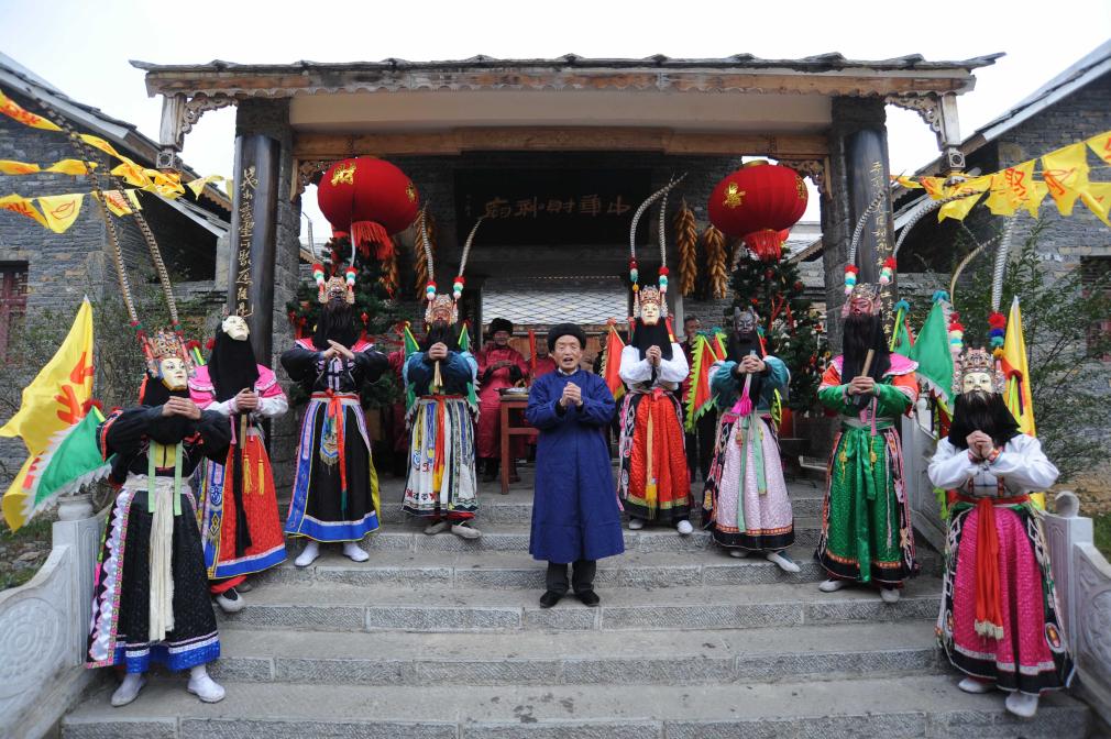 2011年2月7日是农历正月初五,贵州省平坝区天龙屯堡古镇举行迎财神等民俗活动。这是演员在表演祭祀场景。
