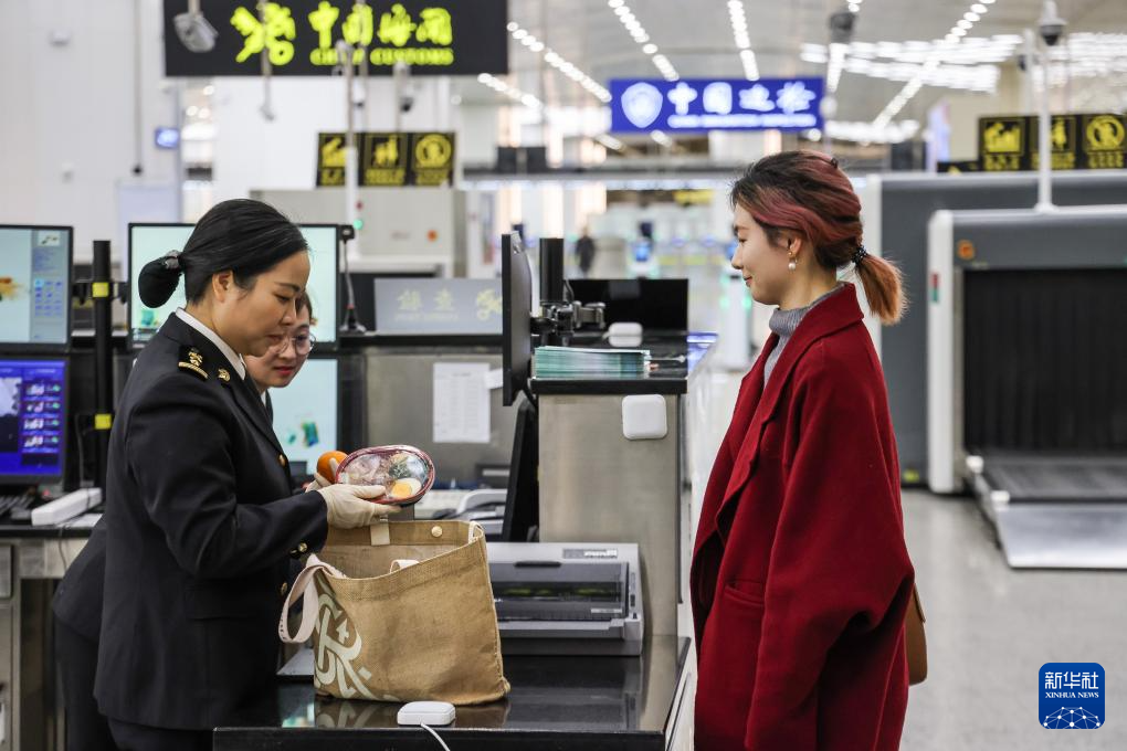 3月1日,横琴口岸海关工作人员对澳门市民程曦的行李进行查验。程曦是横琴粤澳深度合作区正式封关运行后首位通关的旅客。新华社记者 卢汉欣 摄pagebreak