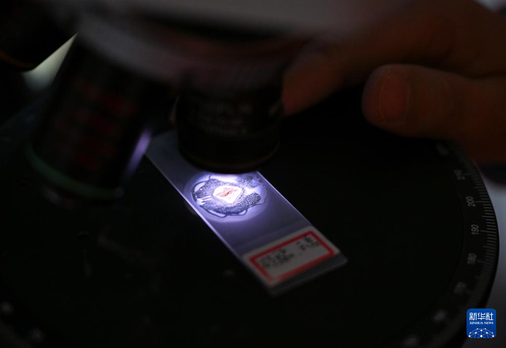 3月3日,科研人员在深地塔科1井用显微镜研究地底深处取上来的岩屑。新华社记者 李响 摄