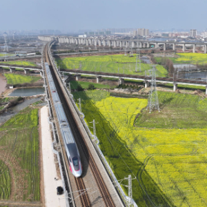 2024年3月2日,一辆高铁列车从江西省南昌市南昌县一处油菜花田旁驶过(无人机照片)。新华社记者 金良快 摄