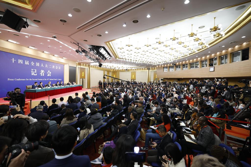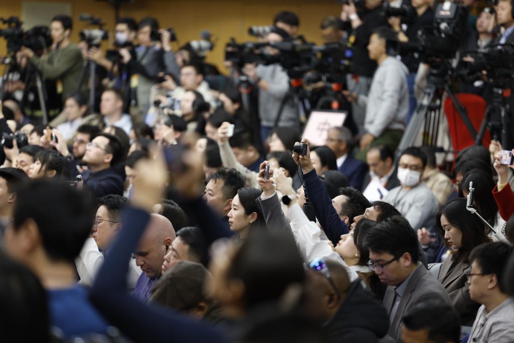 3月6日,十四届全国人大二次会议在北京梅地亚中心新闻发布厅举行记者会。国家发展和改革委员会主任郑栅洁、财政部部长蓝佛安、商务部部长王文涛、中国人民银行行长潘功胜、中国证券监督管理委员会主席吴清就发展改革、财政预算、商务、金融证券等相关问题回答中外记者提问。这是记者在现场采访。