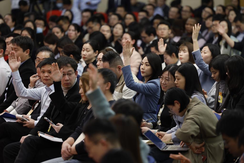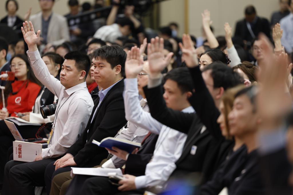 3月6日,十四届全国人大二次会议在北京梅地亚中心新闻发布厅举行记者会。国家发展和改革委员会主任郑栅洁、财政部部长蓝佛安、商务部部长王文涛、中国人民银行行长潘功胜、中国证券监督管理委员会主席吴清就发展改革、财政预算、商务、金融证券等相关问题回答中外记者提问。这是记者举手提问。