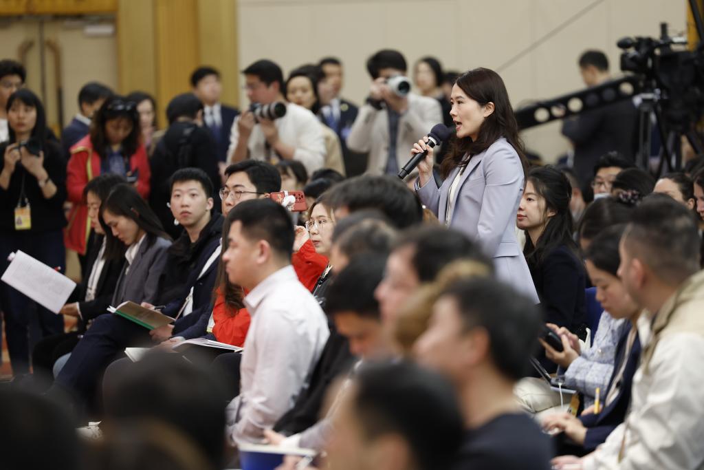 3月6日,十四届全国人大二次会议在北京梅地亚中心新闻发布厅举行记者会。国家发展和改革委员会主任郑栅洁、财政部部长蓝佛安、商务部部长王文涛、中国人民银行行长潘功胜、中国证券监督管理委员会主席吴清就发展改革、财政预算、商务、金融证券等相关问题回答中外记者提问。这是新华社记者在提问。