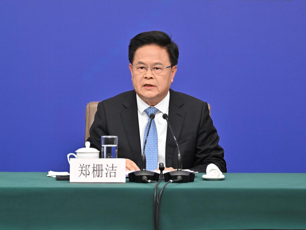 3月6日,十四届全国人大二次会议在北京梅地亚中心新闻发布厅举行记者会。国家发展和改革委员会主任郑栅洁、财政部部长蓝佛安、商务部部长王文涛、中国人民银行行长潘功胜、中国证券监督管理委员会主席吴清就发展改革、财政预算、商务、金融证券等相关问题回答中外记者提问。这是郑栅洁在回答记者提问。