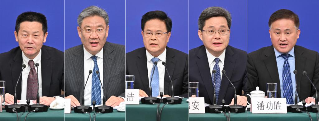 3月6日,十四届全国人大二次会议在北京梅地亚中心新闻发布厅举行记者会。国家发展和改革委员会主任郑栅洁(中)、财政部部长蓝佛安(右二)、商务部部长王文涛(左二)、中国人民银行行长潘功胜(右一)、中国证券监督管理委员会主席吴清(左一)就发展改革、财政预算、商务、金融证券等相关问题回答中外记者提问(拼版照片)。
