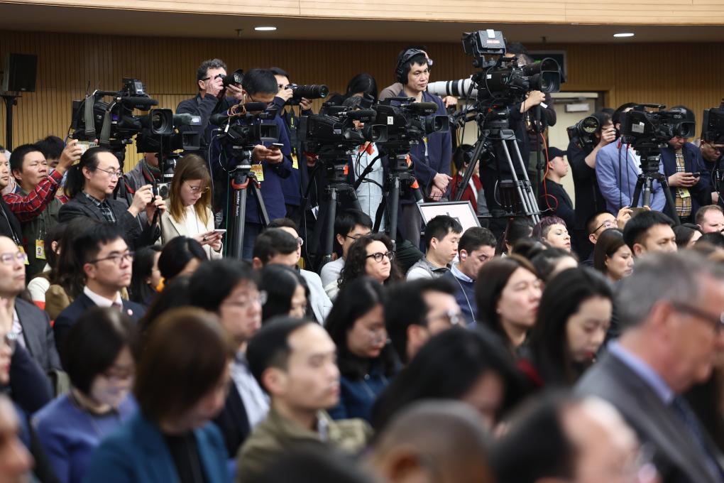 3月7日,十四届全国人大二次会议在北京梅地亚中心举行记者会。中共中央政治局委员、外交部长王毅就中国外交政策和对外关系回答中外记者提问。这是记者在现场采访。