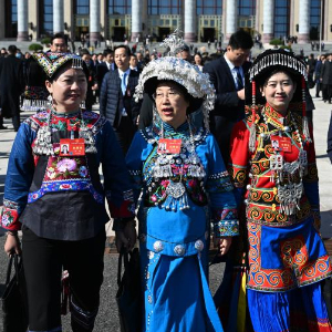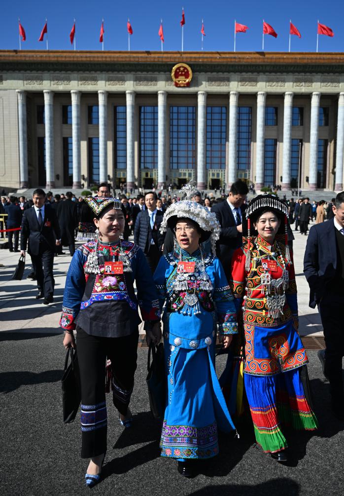 3月8日,参加完十四届全国人大二次会议第二次全体会议的全国人大代表卢丹(左)、赵子铱(中)、付庆梅走出北京人民大会堂。