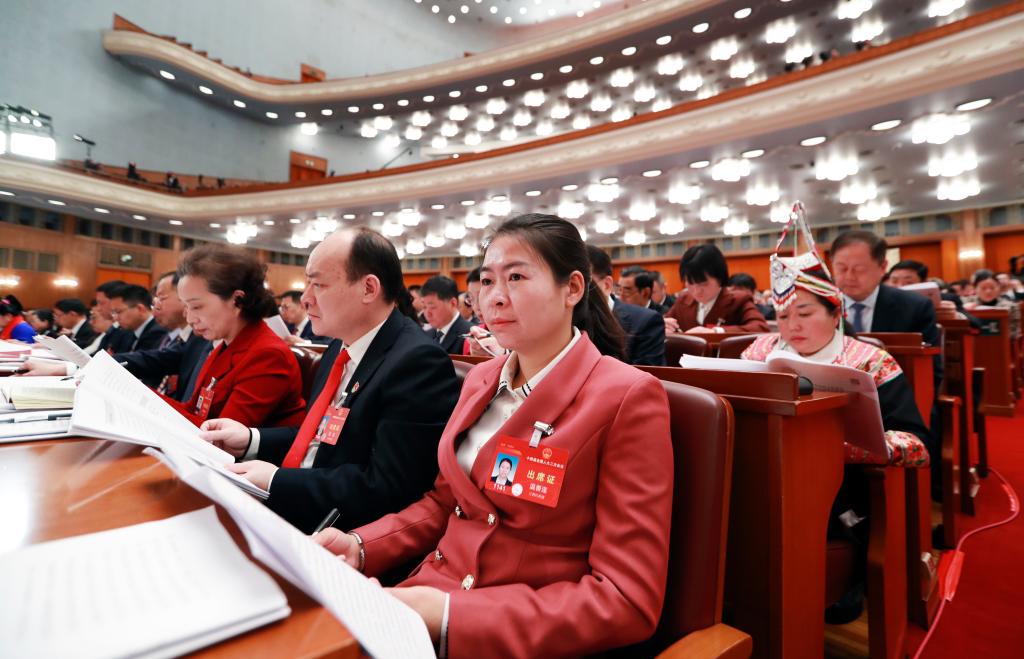3月8日,温善连代表(前右一)在十四届全国人大二次会议第二次全体会议上认真听会。