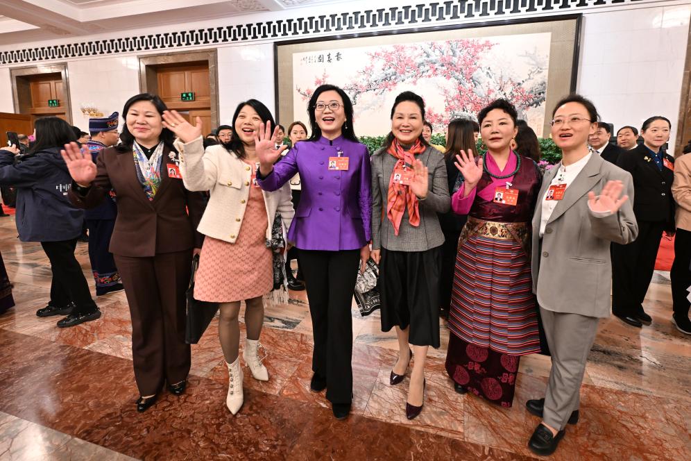 3月8日,在十四届全国人大二次会议第二次全体会议开始前,女代表祝大家妇女节快乐。