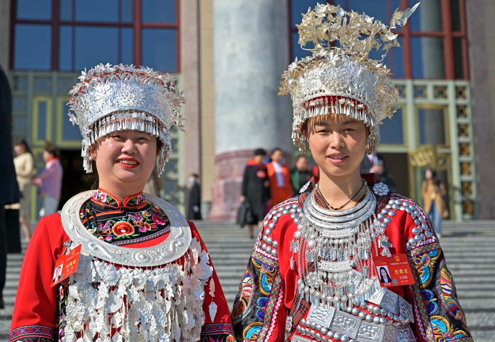 3月8日,参加完十四届全国人大二次会议第二次全体会议的全国人大代表张尧(左)和王海霞在北京人民大会堂前合影留念。