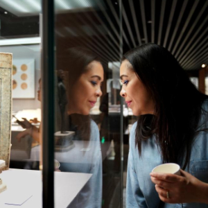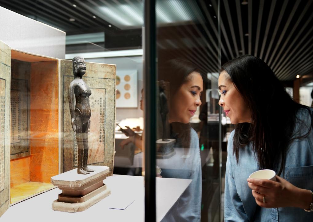 2021年5月28日,在上海中医药大学的上海中医药博物馆,外籍人士观看针灸铜人像。新华社记者 刘颖 摄