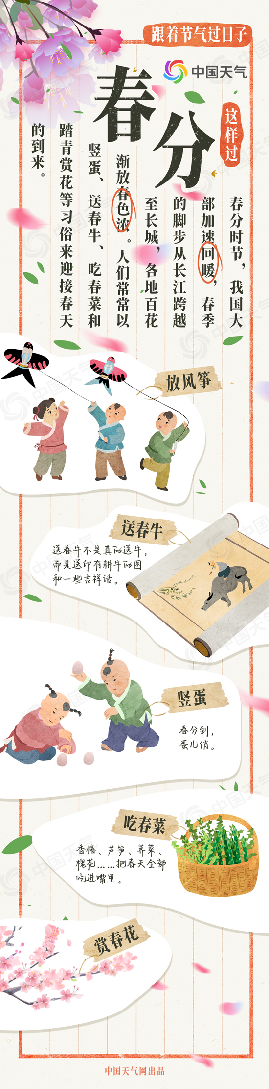 春生夏长,秋收冬藏,跟着节气过日子。今天(3月20日)进入春天的第四个节气——春分。此时,我国大部加速回暖,春姑娘的脚步从长江跨越至长城,百花渐开春意浓。为了迎接春天,民间有竖蛋、送春牛、吃春菜和踏青赏花等习俗。中国天气网特别推出春分风俗图鉴和春分全国天气地图,看看这个节气怎么过。