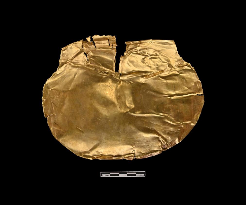 “最让我印象深刻的,还是金覆面。”黄富成回忆,刚出土时,金覆面就贴在墓主人头部西侧的墙壁上。“看到这件器物,第一反应其实是‘奇葩’,一方面夏商周三代墓葬极少出土金器,另一方面扇贝造型也的确非常罕见。”