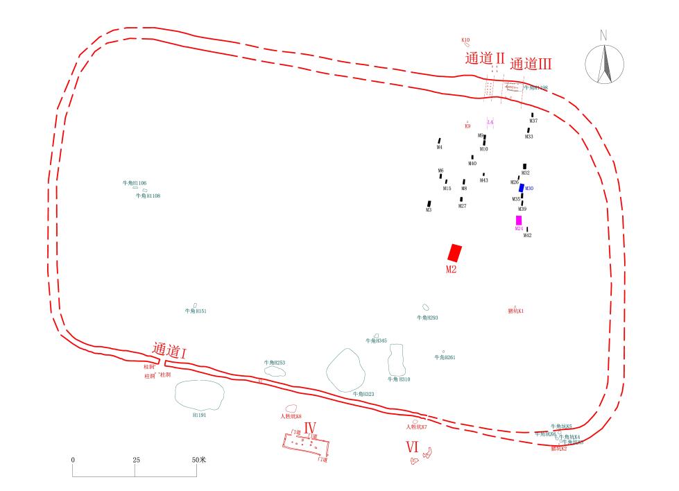 研究发现,书院街墓地由人工挖掘的兆沟合围成近抹角长方形,东西长约240米,南北宽约130米,兆域面积3万余平方米。墓地共发现3处通道。其中,南部通道为陆地通道,北部有2处相邻的栈桥式通道。通道外侧均有门房类相关附属建筑的柱洞遗存。