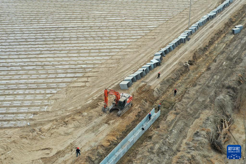 在新疆阿克苏地区阿瓦提县高标准农田核心示范区,施工人员在棉田外修建防渗渠(3月27日摄,无人机照片)。新华社记者 丁磊 摄