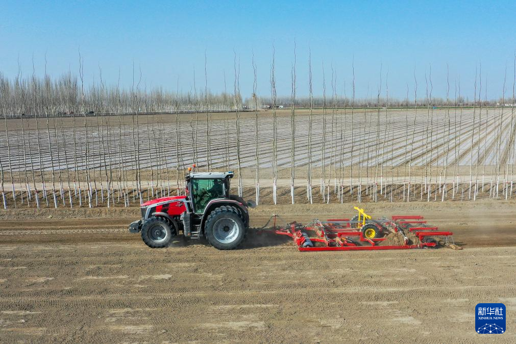 在新疆阿克苏地区阿瓦提县阿依巴格镇幸福村,棉农驾驶平地机在棉田作业(3月26日摄,无人机照片)。新华社记者 丁磊 摄