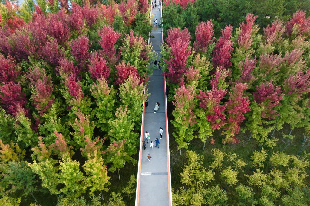 2023年10月7日,市民在陕西西安雁南公园内驻足观景。
