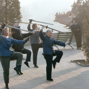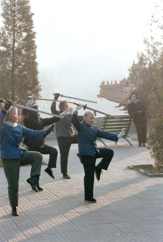 1981年,北京市几位退休职工,清晨来到幽静的北海公园,舞剑健身。