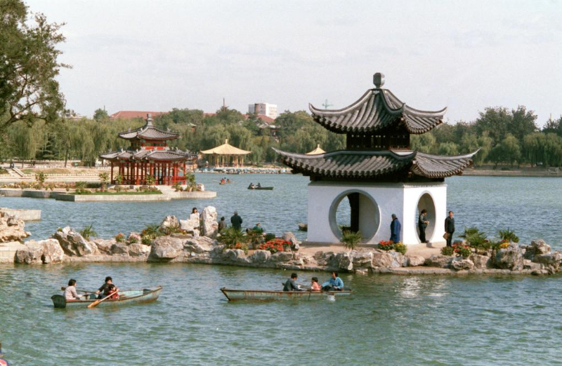 1987年,游人在北京陶然亭公园西湖的湖面上荡舟。