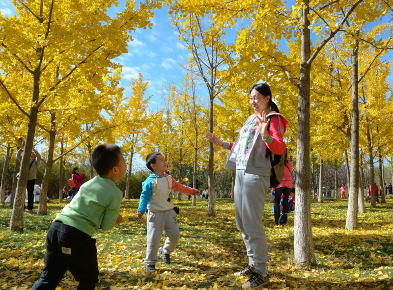 2014年10月26日,人们在北京奥林匹克森林公园欣赏秋色,亲近自然。