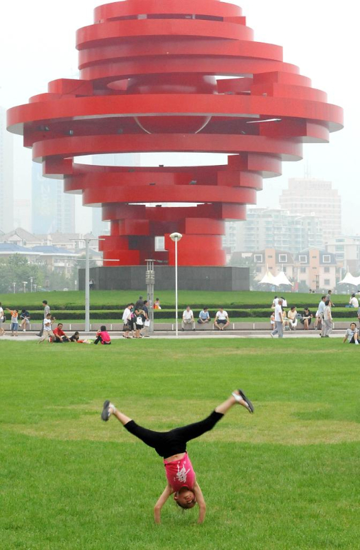 2008年7月28日,一位女孩在青岛五四广场一处草坪上练习幼儿体操。