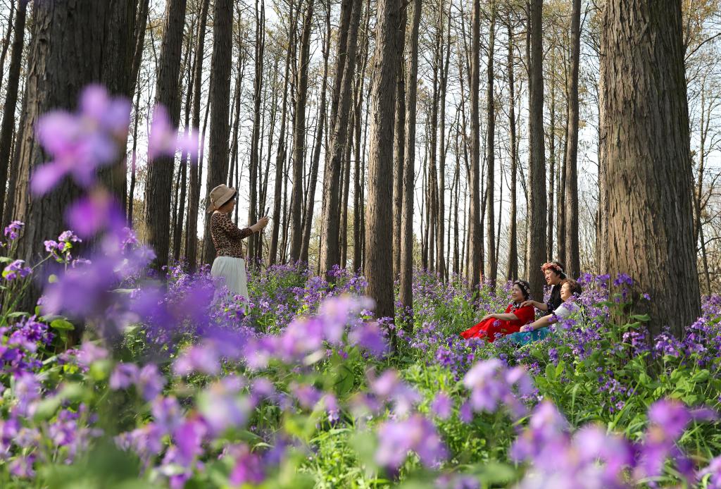 2024年3月29日,游客在上海共青国家森林公园花海拍照。