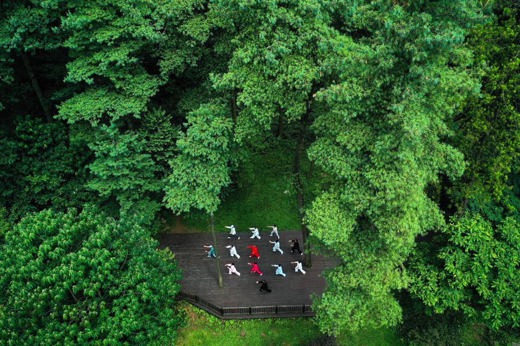 2022年7月13日,市民在贵阳市长坡岭国家级森林公园里健身。