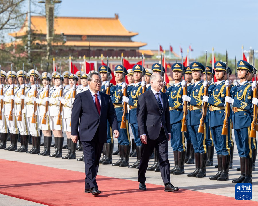 4月16日下午,国务院总理李强在北京人民大会堂同来华进行正式访问的德国总理朔尔茨举行会谈。会谈前,李强在人民大会堂东门外广场为朔尔茨举行欢迎仪式。新华社记者 翟健岚 摄