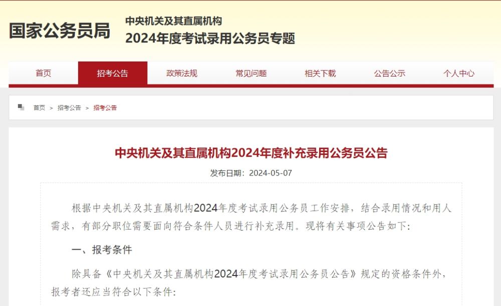 根据中央机关及其直属机构2024年度考试录用公务员工作安排,结合录用情况和用人需求,有部分职位需要面向符合条件人员进行补充录用。现将有关事项公告如下: