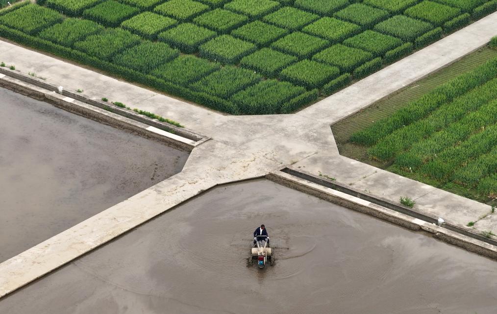 4月16日,在江苏里下河地区农科所(扬州市农科院),农机手驾驶农机翻耕农田(无人机照片)。新华社发(孟德龙摄)