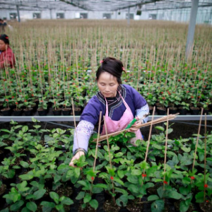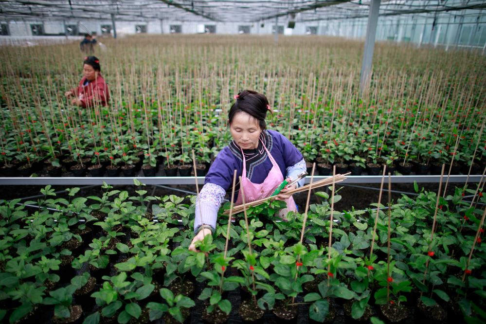 在贵州省榕江县车江坝区智慧育苗中心内,一名少数民族妇女在大棚内对百香果苗进行管理(2023年2月28日摄)。新华社记者 刘续 摄