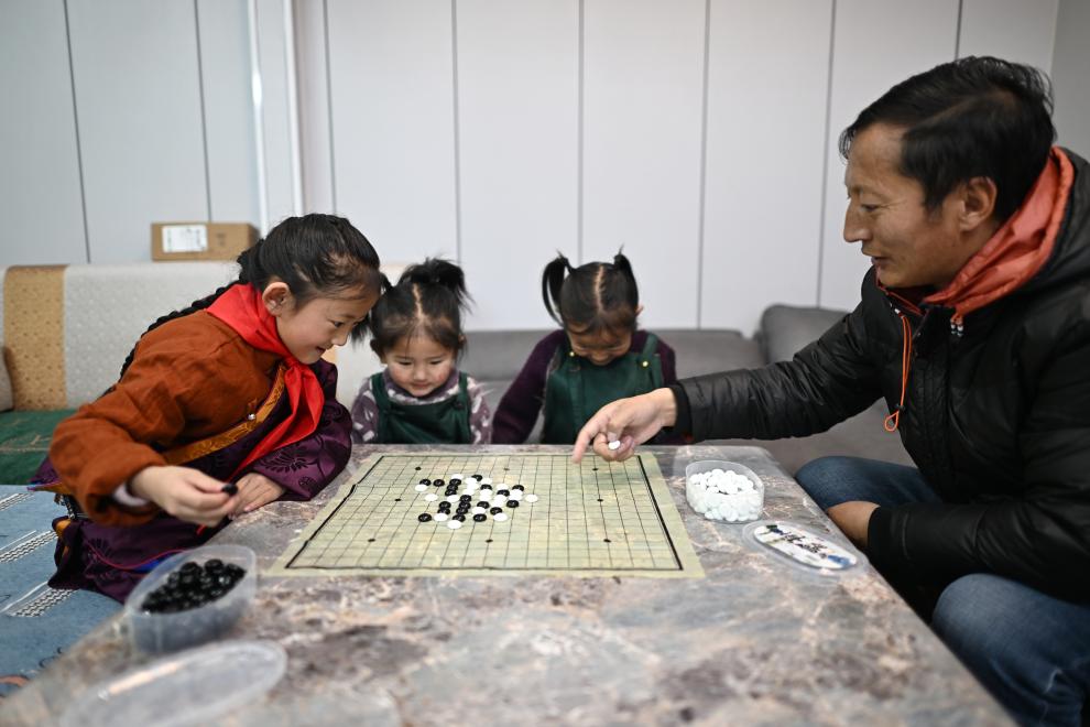 青海玉树曲麻莱县第二民族完全小学学生达沙旦增德金(左一)在家中和爸爸一起下五子棋(2024年1月12日摄)。新华社记者 张宏祥 摄
