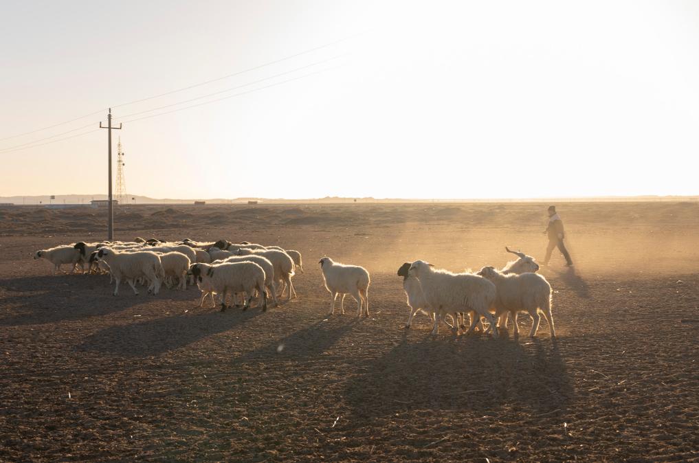 在内蒙古阿拉善左旗乌力吉苏木温都尔毛道嘎查,牧民朝勒门格尔勒在晨光中放羊(2023年11月17日摄)。新华社记者 才扬 摄