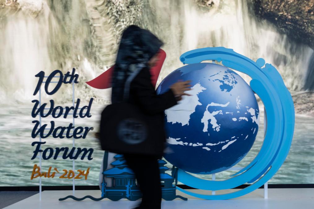 5月20日,在印度尼西亚巴厘岛,一名行人经过第十届世界水论坛标识。第十届世界水论坛20日在印度尼西亚巴厘岛开幕,这是世界水论坛首次在东南亚国家举办。本届论坛以“水促进共享繁荣”为主题,将围绕水安全与繁荣、人类与自然用水、减灾与管理、治理合作与水外交、可持续水融资、知识与创新等议题举办多场会议。新华社发(维里摄)