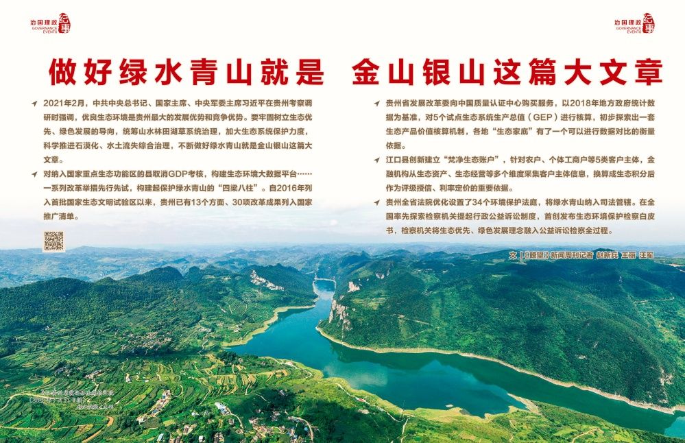 ◇对纳入国家重点生态功能区的县取消GDP考核,构建生态环境大数据平台……一系列改革举措先行先试,构建起保护绿水青山的“四梁八柱”。自2016年列入首批国家生态文明试验区以来,贵州已有13个方面、30项改革成果列入国家推广清单。