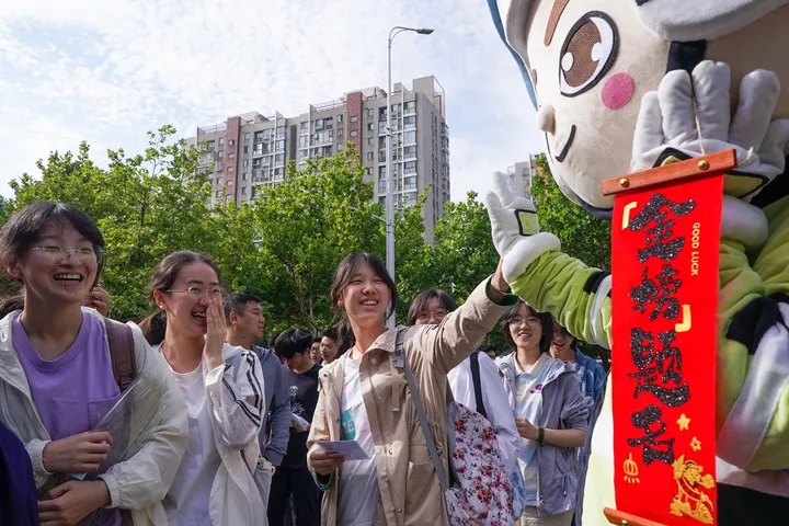 6月7日,在江苏省南京市建邺区中华中学考点,考生与送考人偶击掌。新华社记者 李博 摄