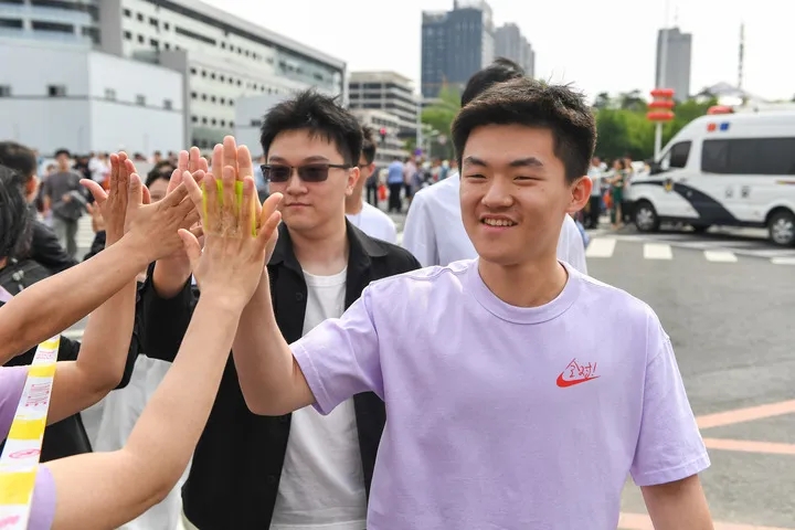 6月7日,在位于吉林长春的吉林省实验中学考点,考生入场前与老师击掌加油。新华社记者 张楠 摄