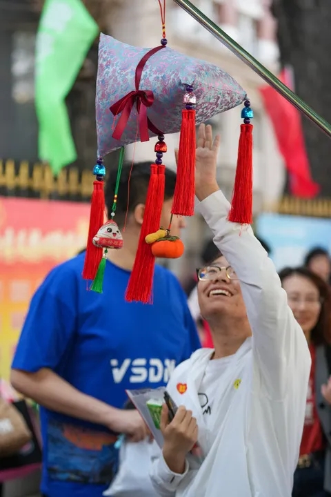 6月7日,在黑龙江哈尔滨市第九中学考点外,一名考生进入考场前伸手碰触“高粽”。新华社记者 王建威 摄