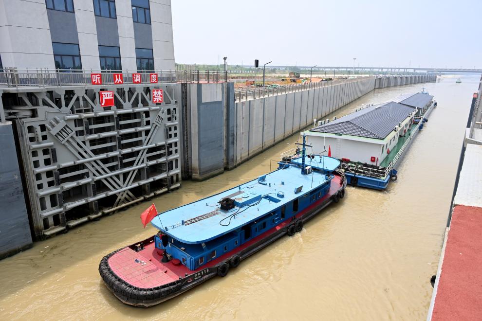 6月7日,一艘船正经过引江济淮工程蜀山船闸。(新华社记者 刘力航 摄)