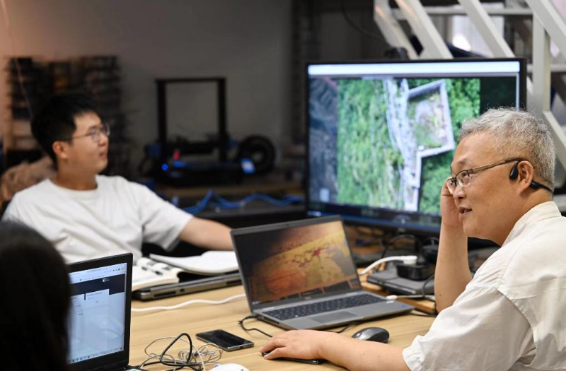 天津大学建筑学院教授李哲(右)和学生在工作室内就拍摄的长城图像进行交流。新华社记者李然 摄