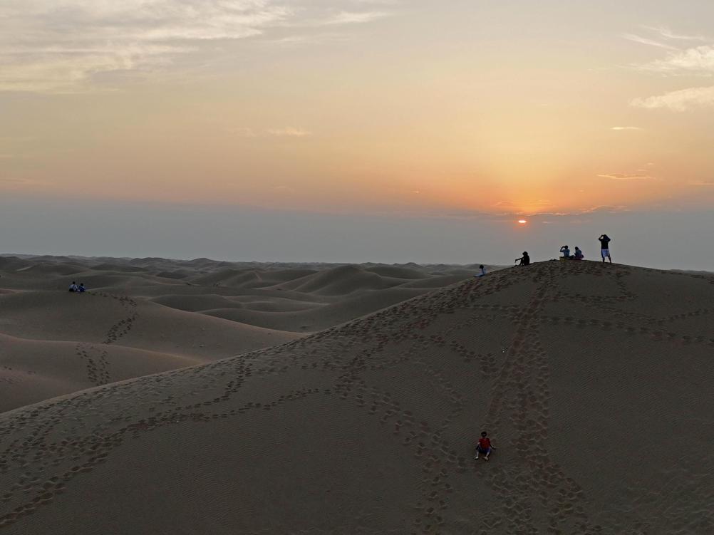 游客在中卫市沙坡头景区沙漠游玩(无人机照片)。 新华社记者 邢广利 摄