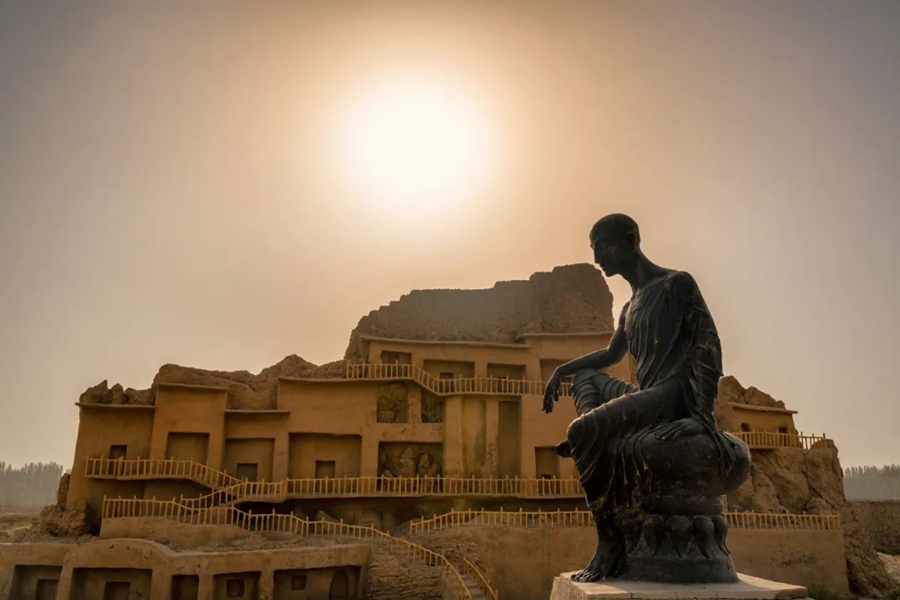 ▲克孜尔石窟前静立着鸠摩罗什雕像。(图片来源:视觉中国)